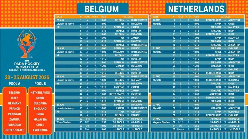 The International Hockey Federation (FIH) is delighted to announce the participating teams and the Pools of the first-ever FIH Para Hockey World Cup, which will take place from 20 to 24 August 2026 in Belgium and the Netherlands, as follows: